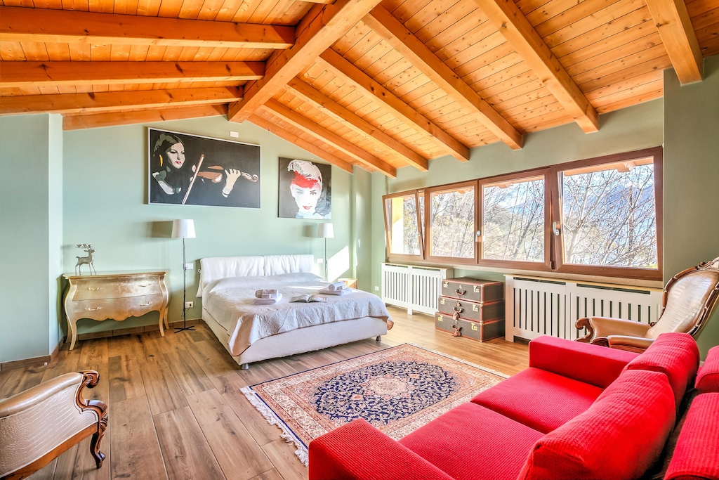 Bedroom 1: The beautiful master bedroom has a double bed, a sofa, antique armchairs, a wardrobe and large windows onto the lake.