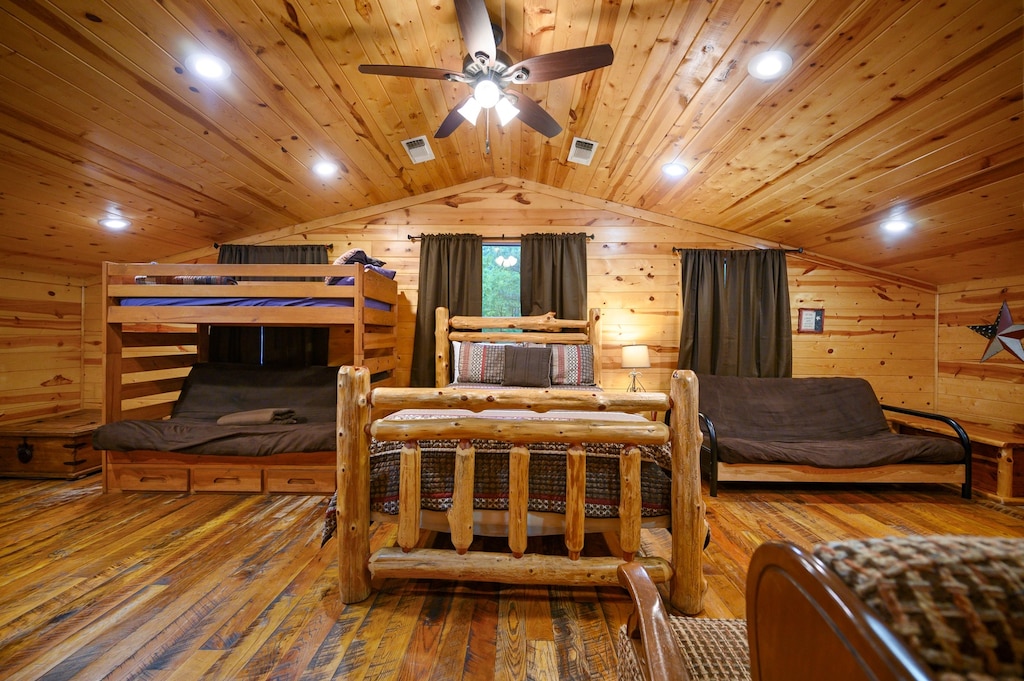 Spanning over 1,700 square feet of thoughtfully designed living space, Sasquatch Hills comfortably accommodates up to 14 guests and those furry friends (make sure to check the end of the description for related fees and additional services), making it ideal for families or groups seeking a spacious getaway. The cabin features two king bedrooms on the main floor, with one offering an ensuite bathroom. The upper level holds a generous room furnished with bunk beds and its own ensuite bathroom, providing a cozy haven for younger guests or additional members of your party. Relive classic gaming moments with the arcade machine in the bunk room featuring over 60 titles.