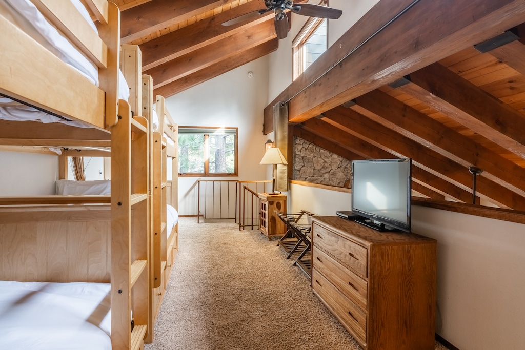 Pet-Friendly Rustic Mountain Condo stands out with its thoughtful combination of spacious design, a fun pinball machine for entertainment, and the added luxury of newly upgraded bathrooms. Its distinctive spiral staircase and panoramic views set it apart from other Mammoth Lakes condos for rent, making it a standout choice for families, friends, or couples looking for something special.