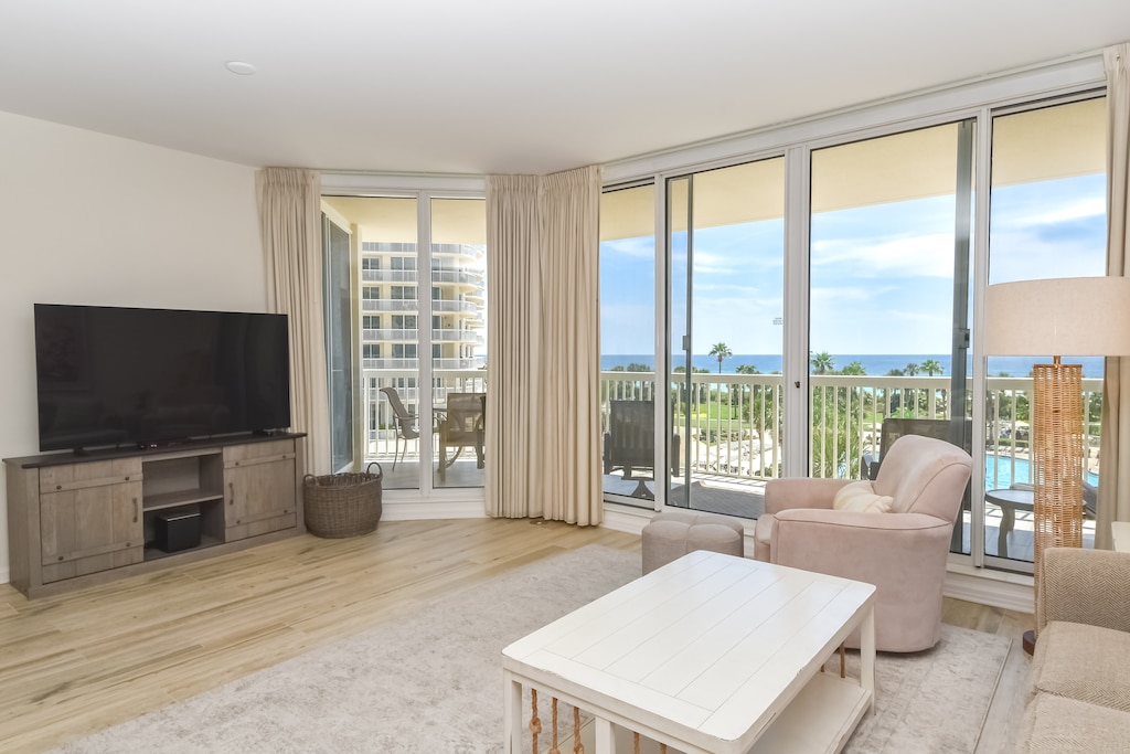 Two additional guest bedrooms are comfortably arranged and share a north-facing balcony that overlooks the landscaped Silver Shells Resort grounds. The first guest bedroom has a queen-sized bed and a closet. The second guest bedroom features two-queen-sized beds and has a closet. The guest bathroom is conveniently located near both guest bedrooms, as well as easily accessible from the main living area.