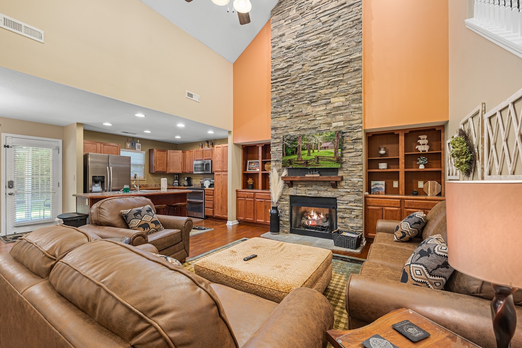 Parkway Hideaway is a luxurious condo for 8 just minutes walking distance from the Pigeon Forge Parkway. The cabin features a 2-car garage, perfect for any of the area car shows. Inside, an impressive floor-to-ceiling fireplace adorns the living room. Upstairs, the loft space offers bunk beds for the kids and a fun multigame arcade. The modern kitchen makes it easy to cook meals. Offering Wifi and Smart TVs to keep you connected. During the summer months you’ll have access to the community pool.