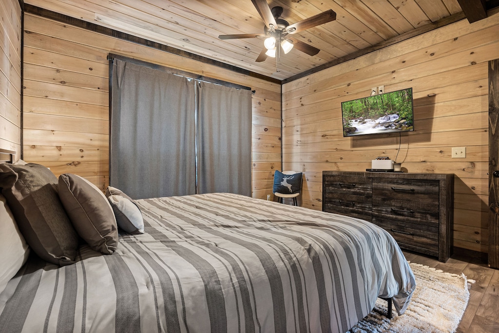 Experience tranquility at Cozy Bear. Enjoy breathtaking mountain views from the deck. With 3 bedrooms, 3 bathrooms, and 2 sleeper sofas, it’s perfect for family getaways or ladies’ retreats. The spacious kitchen with stainless steel appliances and granite countertops is great for entertaining. Cozy Bear offers 7 TVs for entertainment, ensuring everyone’s enjoyment. Conveniently located near Gatlinburg and Pigeon Forge attractions, it combines luxury, space, and stunning views.