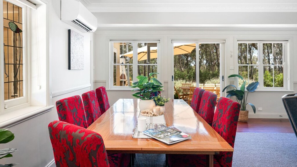 Step into the charm of Balmaghie, a beautifully renovated 4-bedroom mud brick home, set on seven secluded acres, combining character and modern comfort. This unique residence boasts pavilion-style living, with covered timber walkways connecting the guest accommodation to the main wing. The interiors feature quality finishes, including timber flooring in the living spaces, plush carpeting in the bedrooms, and underfloor heating in the main bedroom wing. The open-plan lounge is a cosy retreat with a slow-combustion fireplace, while the well-appointed chef’s kitchen and dining area are perfect for entertaining. French doors in every bedroom provide seamless indoor-outdoor flow, creating a bright and inviting atmosphere throughout. French elegant furnishings throughout.