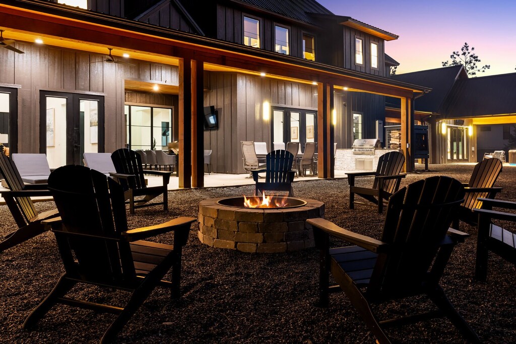 When it’s time for fun, the private game room awaits, featuring a pool table, Buck Hunt game, shuffleboard table, and chic swinging chairs. As night falls, gather around the glowing fire pit and take in the breathtaking night sky.