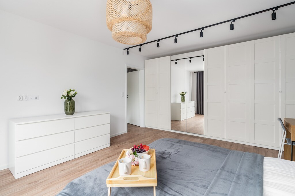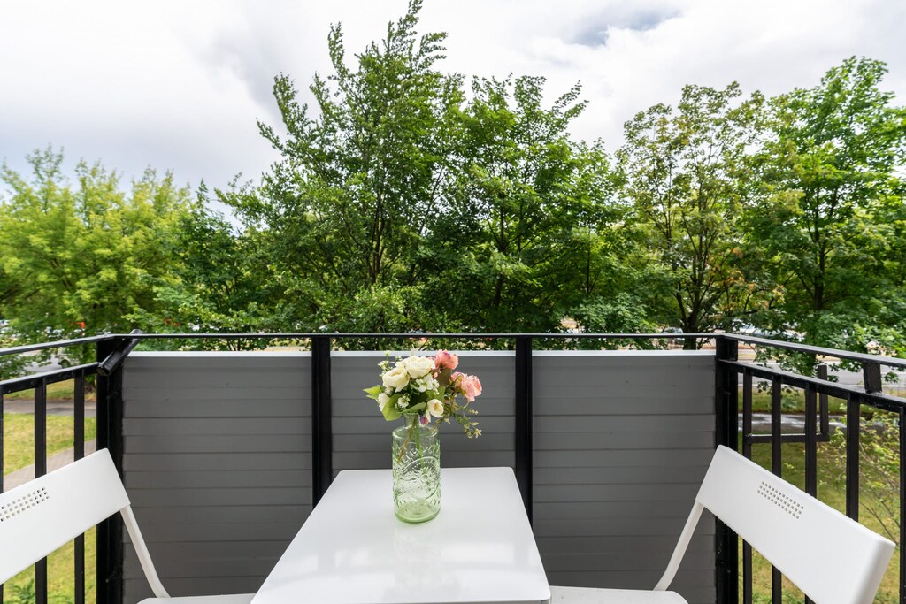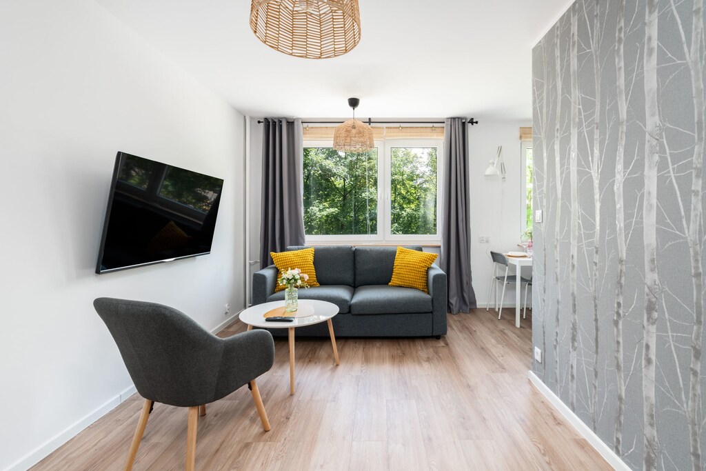 The fully equipped apartment is suitable for 4 people or a couple. The area of 46 m² consists of a living room with a kitchenette, one bedroom and a bathroom with a shower. There is also a balcony equipped with garden furniture, which offers a view of the peaceful, green surroundings. The apartment is stylishly decorated in a modern style, which gives the space a lightness- the apartment is characterized by fashionable shades of white and gray and mustard-colored accessories. The apartment is also functionally furnished: in the bedroom there is a desk with a chair and lamp, ideal for a place to work with a laptop. The comfort of your stay is guaranteed by rich furnishings, such as multimedia (free high-speed Wi-Fi, flat-screen TV) and household appliances (washing machine, dryer, dishwasher, hair dryer). A set of bed linens, towels and complimentary toiletries (gel, shampoo, soap) are provided for a good start to your stay. Guests traveling by car can park in front of the building if spaces are available (free parking zone around the property).