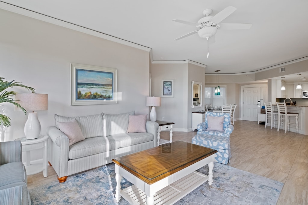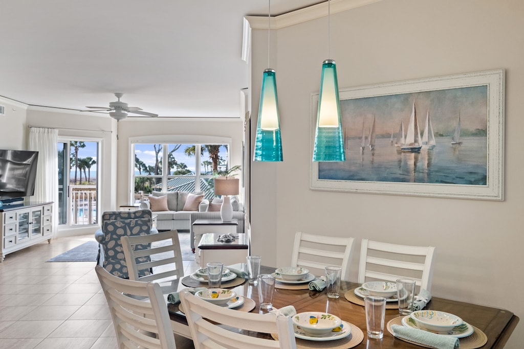 The kitchen is beautiful with its custom cabinetry, granite countertops and stainless steel appliances. It is fully-equipped with all the accoutrement of home, making cooking a meal for the family an easy task. The kitchen bar seats two. Adjoining the kitchen is the formal dining area which seats six. Beyond the dining area, the living area features beach contemporary furniture, including a queen sofa bed, along with a Smart 70” TV and slider to your private balcony overlooking the Atlantic Ocean.