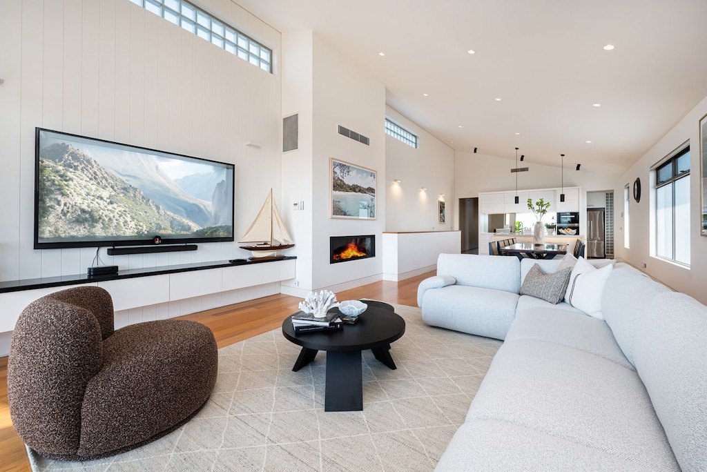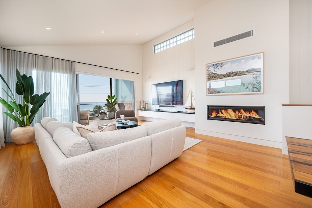 Spanning two spacious levels and serviced by a private lift, the home offers seamless indoor-outdoor living with curated high-end furnishings and 180-degree water views from the expansive upper balcony. The light-filled living area features soaring 4.4m ceilings, a cozy gas fireplace, a large Smart TV with Foxtel, and floor-to-ceiling windows that open to an outdoor lounge — the perfect spot to sip wine as the sun sets over the bay.