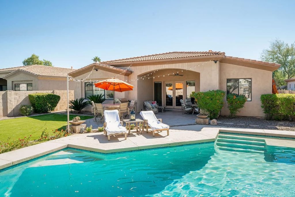 This charming home offers a versatile layout that’s great for both social gatherings and quiet downtime. Its interior is thoughtfully designed, combining comfortable seating and tasteful décor with a baby grand piano for a touch of sophistication. The home includes four cozy bedrooms with calming color schemes. The master suite boasts a spa-style bathroom designed for relaxation. The kitchen is well-equipped to handle any meal, complemented by sleek countertops and modern appliances. There is a formal dining area nearby for mealtime gatherings. Step outside to enjoy the tranquil pool area and well-kept gardens, featuring lounge seating and a grill for relaxed Arizona evenings.
