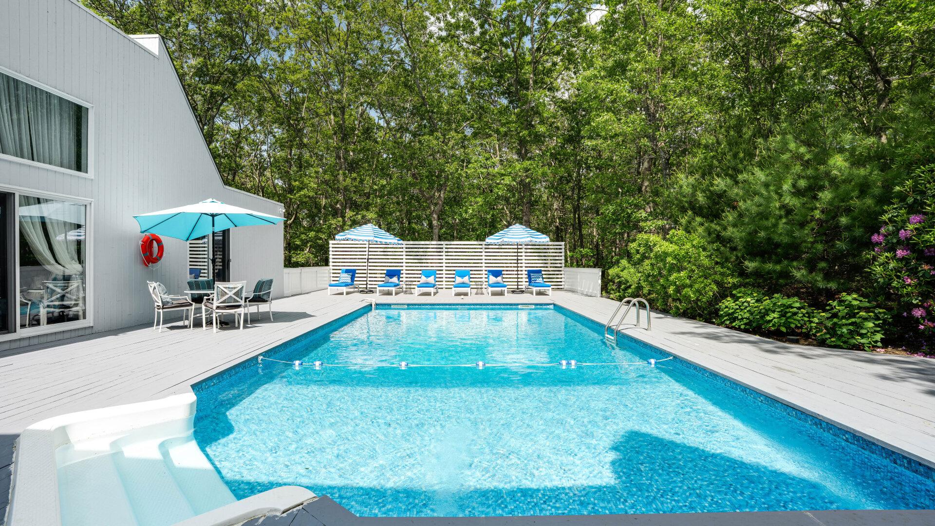 Deck/Patio (Uncovered), Grill (Gas), Tennis Court (Private), Outdoor Shower (Hot + Cold Water), Patio Furniture (Table, Chairs, Umbrella), Tennis Equipment (Rackets, Balls), Fence Around The Pool, Fire Pit (Wood), Lounge Chairs (6 Chairs), Beach Umbrella, Cooler, Beach Chairs, Private Pool (Outdoor, Freshwater, Heated)