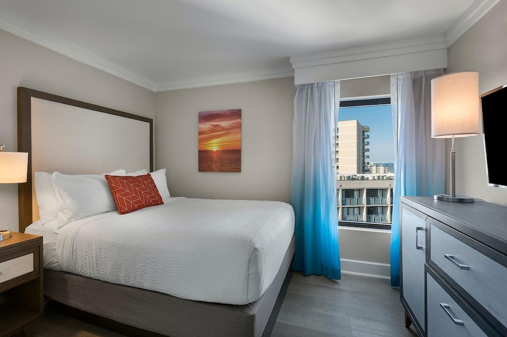 Our spacious Oceanfront Three Bedroom Condo has a king bed in the master bedroom, a queen bed in the second bedroom and two double beds in the third bedroom. This room type also includes a separate living room with a sleeper sofa, two full bathrooms, a television in each of the bedrooms and the living room, a fully equipped kitchen with all basic cookware and dinnerware as well as a stackable washer and dryer combination and a private oceanfront balcony.