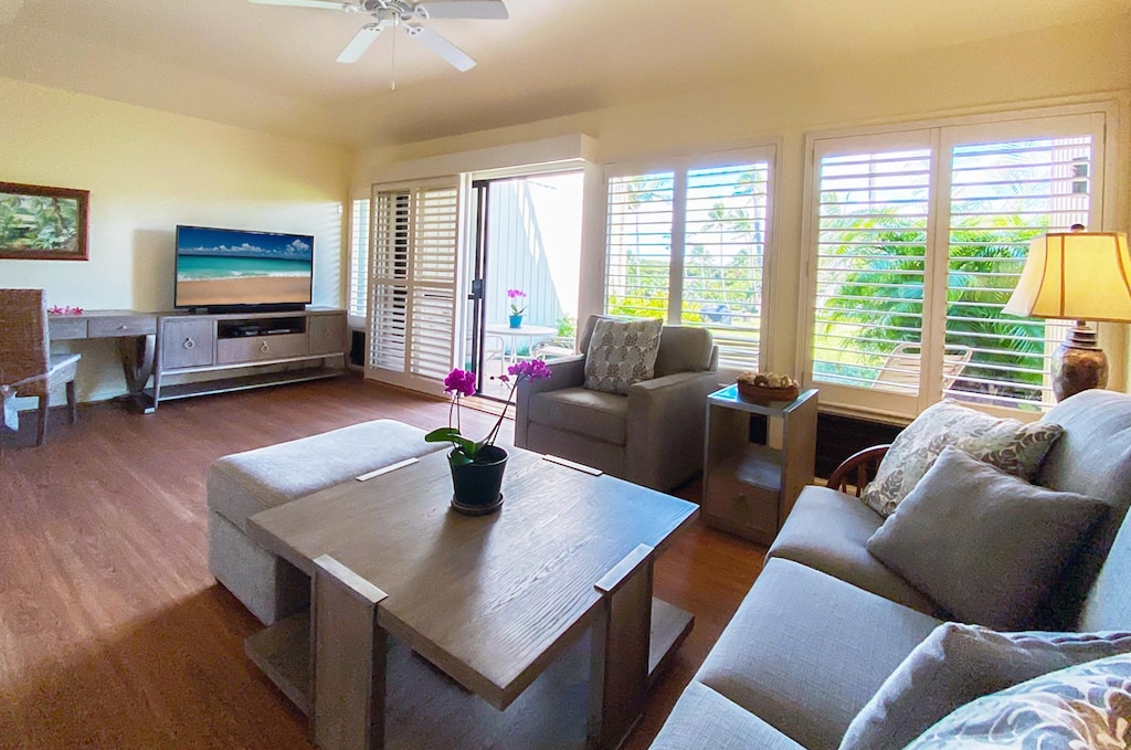 The condo is equipped with modern amenities to ensure a comfortable stay, including cable TV with a DVD player, wireless internet with fast download and upload speeds, portable air conditioning in the three bedrooms, ceiling fans, and a washer/dryer for your convenience. You’ll have access to two pools, including an ocean-view pool at Manualoha, as well as the Poipu Kai pool. The resort also provides BBQs for outdoor cooking. All linens, including beach towels, are provided, and the fully equipped kitchen allows you to prepare meals at your leisure.