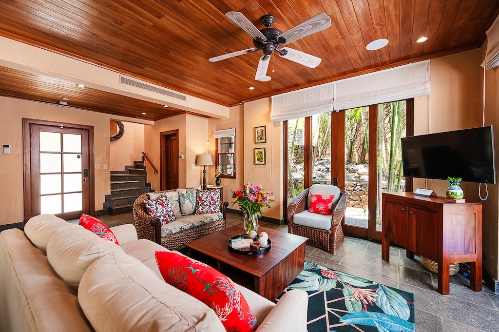 This beautiful home has an open concept floor plan with lots of natural light and light ocean breeze. On the first floor you will find a relaxing living room which opens up to the private pool area. Enjoy a fully equipped kitchen and dining room, as well as a half bathroom. On the second floor there are 2 bedrooms, each with their own ensuite bathroom. The master bedroom has a king-sized bed and the second bedroom has a queen bed with trundle. Each bedroom also has its own private balcony overlooking the lush tropical gardens. The outdoor pool area has a patio with dining table and BBQ for making a delicious home cooked meal. Relax by the pool on the lounge chairs or take a dip in the pool to cool off!