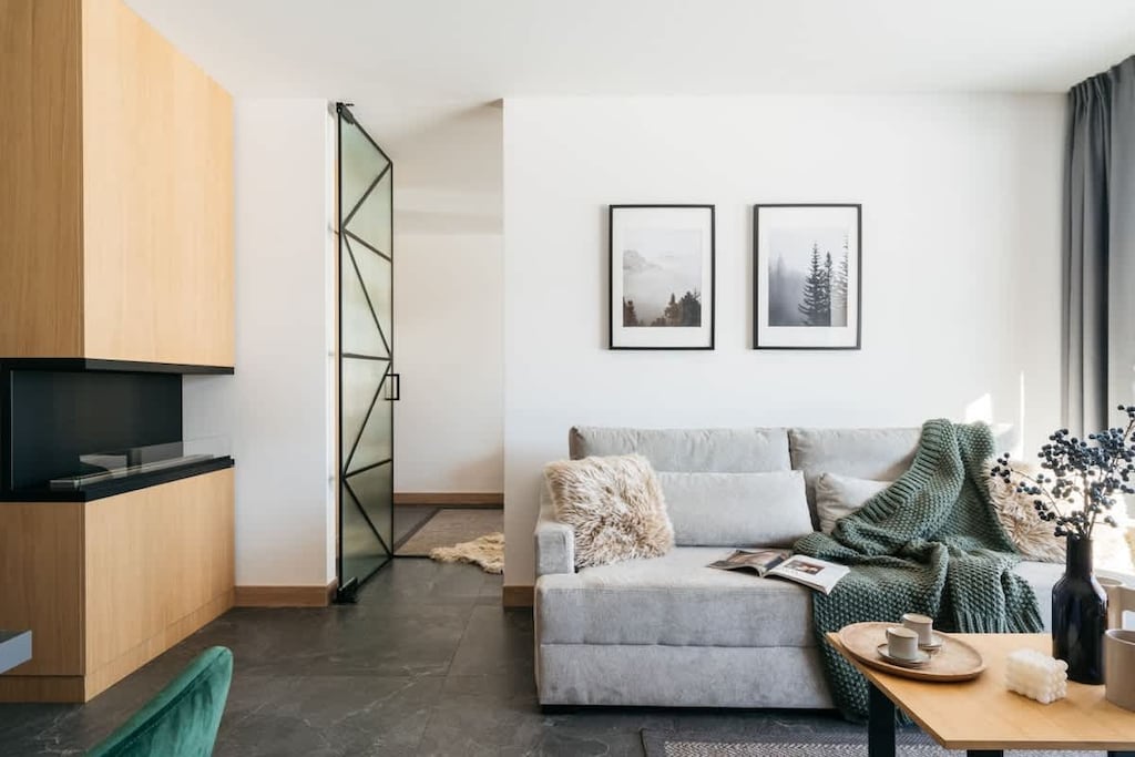 The apartment is located of the newly built villas. The space has been designed to reflect the mountain atmosphere and combine it with modern natural materials. Thanks to this, we can invite you to the interior, where the highlander herringbone perfectly fits with fashionable materials and furniture. The apartment is designed for five people, offering a comfortable QueenSize bed, 2 sofa beds with sleeping function. In the living space there is a kitchenette equipped with the most necessary equipment (including a dishwasher, coffee machine, kettle, etc.). There is also a washing machine, and the bathroom is equipped with a shower. In the seating area you will find a TV with terrestrial TV. The apartment also has high-speed wireless Internet (WiFi).
