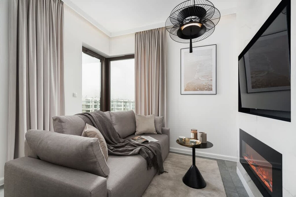 W salonie znajduje się duża sofa i miejsce do spędzania przytulnych wieczorów. Do dyspozycji gości pozostaje wygodna, rozkładana sofa, Smart TV, kominek elektryczny. Apartament wyposażony jest również w aneks kuchenny wyposażony we wszystkie niezbędne sprzęty: lodówka, piekarnik, zmywarka, płyta grzewcza i okap.