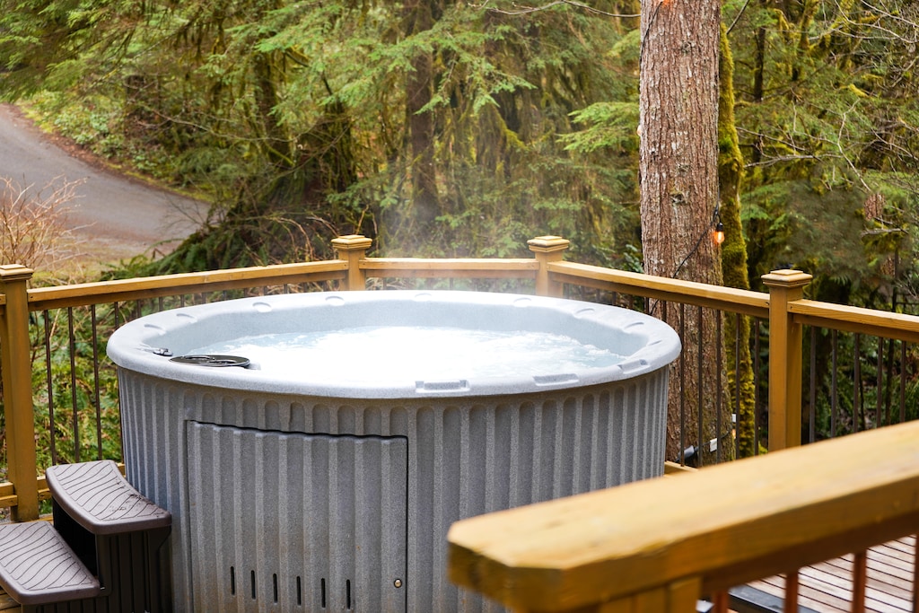 The spacious front deck is great for socializing and soaking in nature with a BBQ, outdoor furniture and a new hot tub. Dine alfresco on the deck in the warm summer nights.