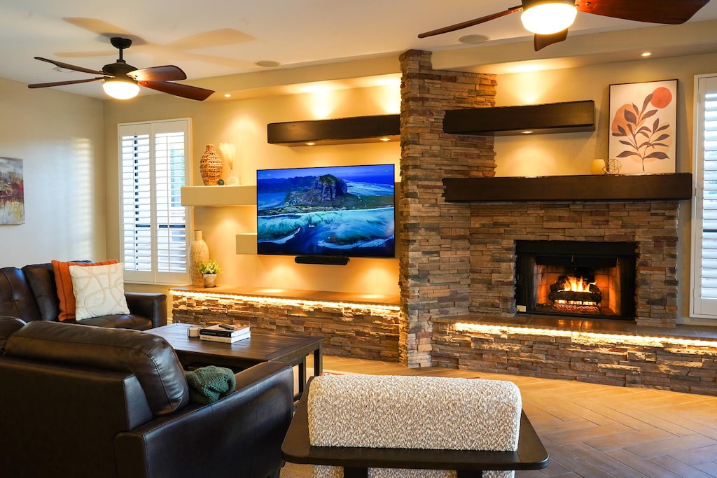 Unwind in the media room, where plush sofas and a state-of-the-art entertainment system promise evenings of cinematic immersion. Challenge your friends to a friendly game of billiards, the rhythmic click of the balls echoing through the air. Or step outside onto the spacious patio, where a sparkling plunge spool which doubles as both a pool and a bubbling hot tub invite you to soak in the Arizona sunshine.