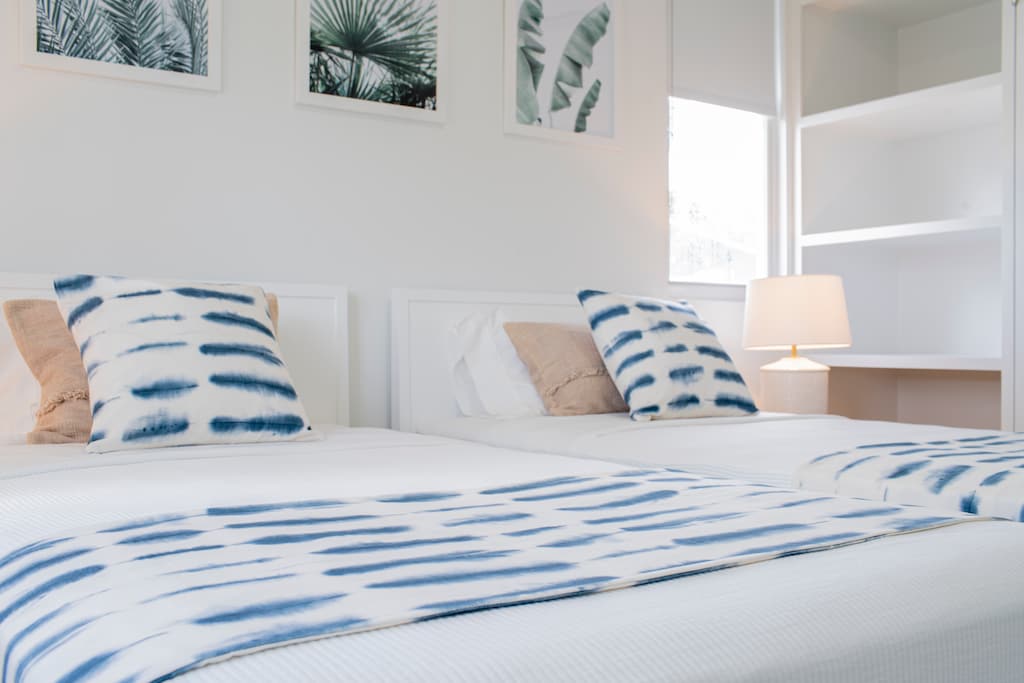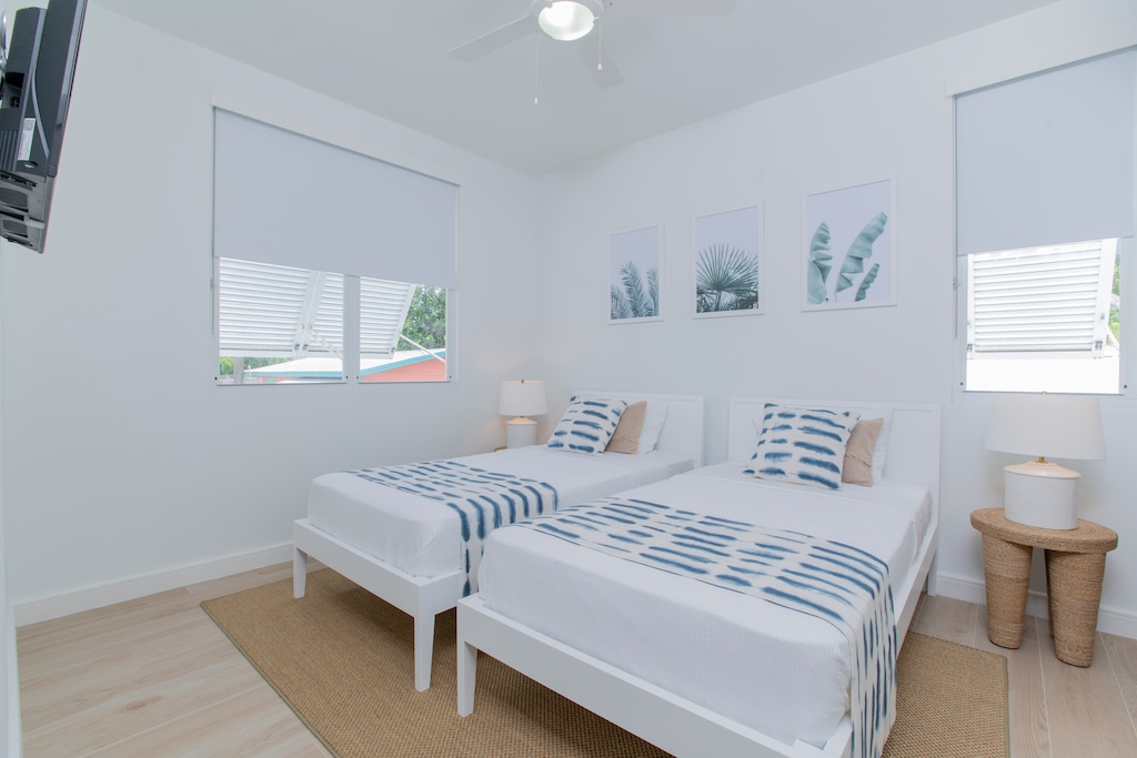 Third Bedroom: Two twin beds, fully air-conditioned, TV with cable television, ceiling fan, and sharing the same guest bathroom as the second bedroom, which includes a walk-in shower