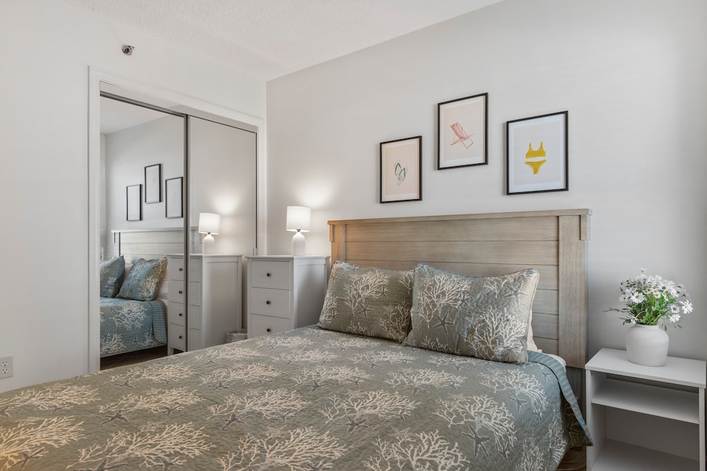 The second bedroom is equally cozy, also featuring a queen-sized bed and easy access to the hallway guest bathroom, which includes a walk-in shower for added convenience.