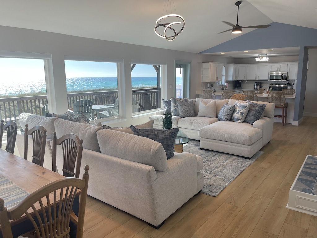 A wall of windows on the main floor brings the breathtaking emerald waters of the Gulf right into your living space, creating a seamless connection between indoors and out. The open-concept layout ensures your group can be together—whether playing games, preparing meals, reading, working at one of two desks, or simply lounging while watching TV. Keep an eye out for dolphins splashing just beyond the waves!