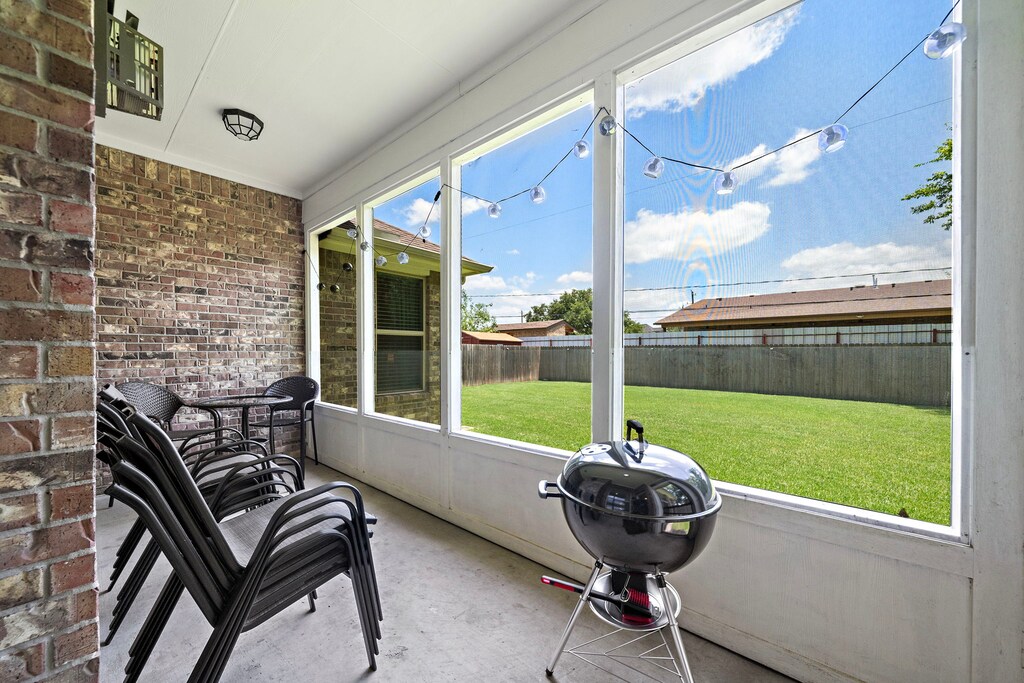 • Private backyard w/ spacious lawn + patio seating + charcoal BBQ grill