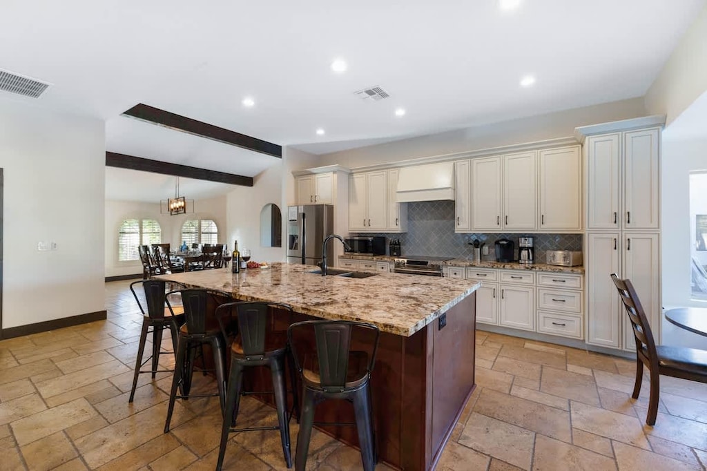 This amazing home has plenty of room for your family to relax and unwind. With 7 beautifully appointed bedrooms and 5 bathrooms, you can’t go wrong. The vast outdoor area features a heated pool with a grotto, a built-in water slide, an above-ground hot tub, and a swim-up bar to the ramada equipped with a new Traeger Gas grill, mini fridge, and TV for all your entertaining needs. Practice your short game on the putting green or relax on the many chaise lounge chairs around the pool and bask in the Arizona sun! Too hot outside? Relax in our newly built movie theatre, with projector and Sonos surround sound.
