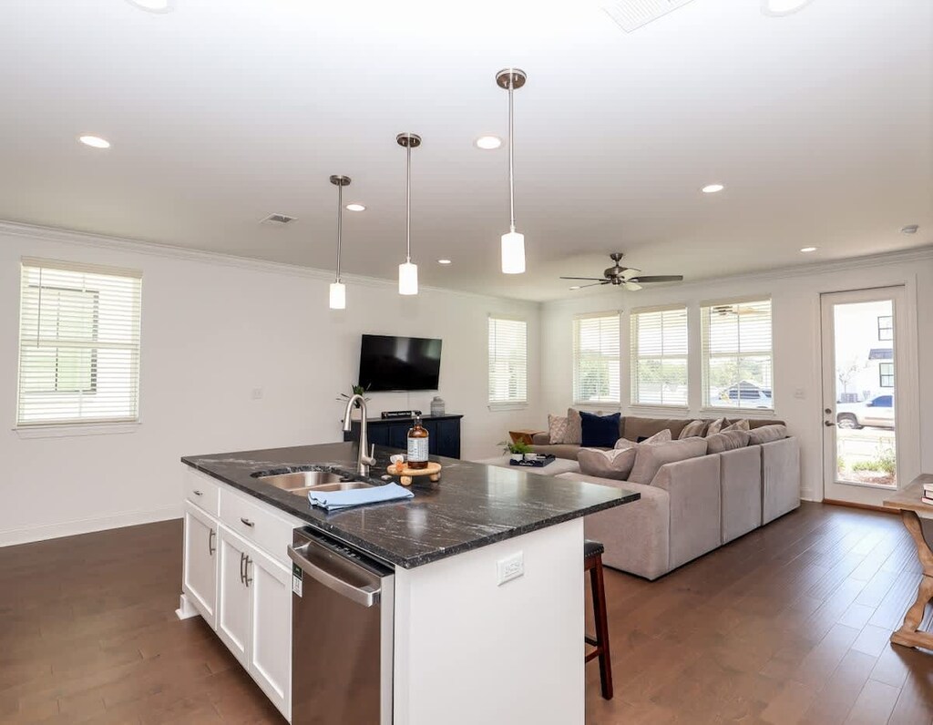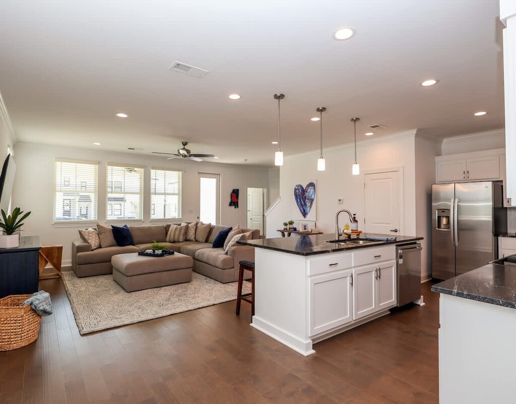 Step into a beautifully lit open-concept living and dining area where natural light and modern elegance shine. Whether you’re entertaining or enjoying a cozy night in, the seamless flow makes every moment feel special.