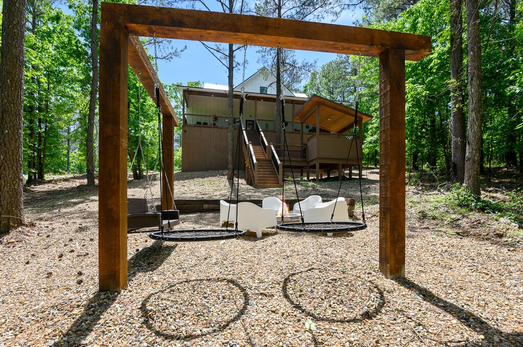 - Stone fire pit with custom fire pit swings for s’mores, stories, and stargazing