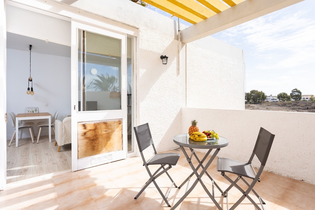 With a nice decoration, this apartment is ideal for couples, families and friends, with capacity for 4 people, two nice bedrooms, one with a queen size bed and the other with two single beds and views to the garden. The spacious living-dining room has an integrated equipped kitchen and direct access to the flat’s terrace, where you can disconnect and relax in a pleasant environment. With a bathroom, Smart TV, Wifi Internet and all the necessary amenities. Located in an exclusive residential complex with two swimming pools, one of them for children and spacious communal areas. With numerous sunbeds to relax and sunbathe in an unbeatable location with beautiful views.Very good location, in a quiet area, but only a few minutes drive from the beach, restaurants and the main points of interest in the south of the island.