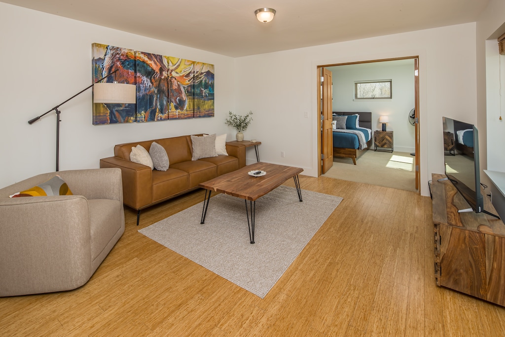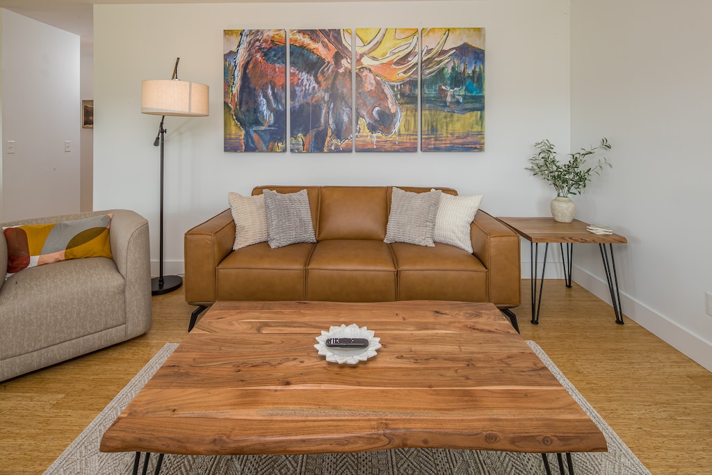 As you step inside the home, it features a warm and inviting layout. The open-concept layout seamlessly connects the living room to the dining area with seating for 6, to the fully equipped kitchen, where you can prepare delicious meals or gather around the dining table as a family. The living room is perfect for relaxing evenings, with a comfortable leather couch, a smart TV, and plenty of natural light and bountiful views. With 2 well-appointed bedrooms, Skyfall’s main bedroom hosts a plush king bed, and the second bedroom features a cozy queen bed, both allowing for a restful night’s sleep.