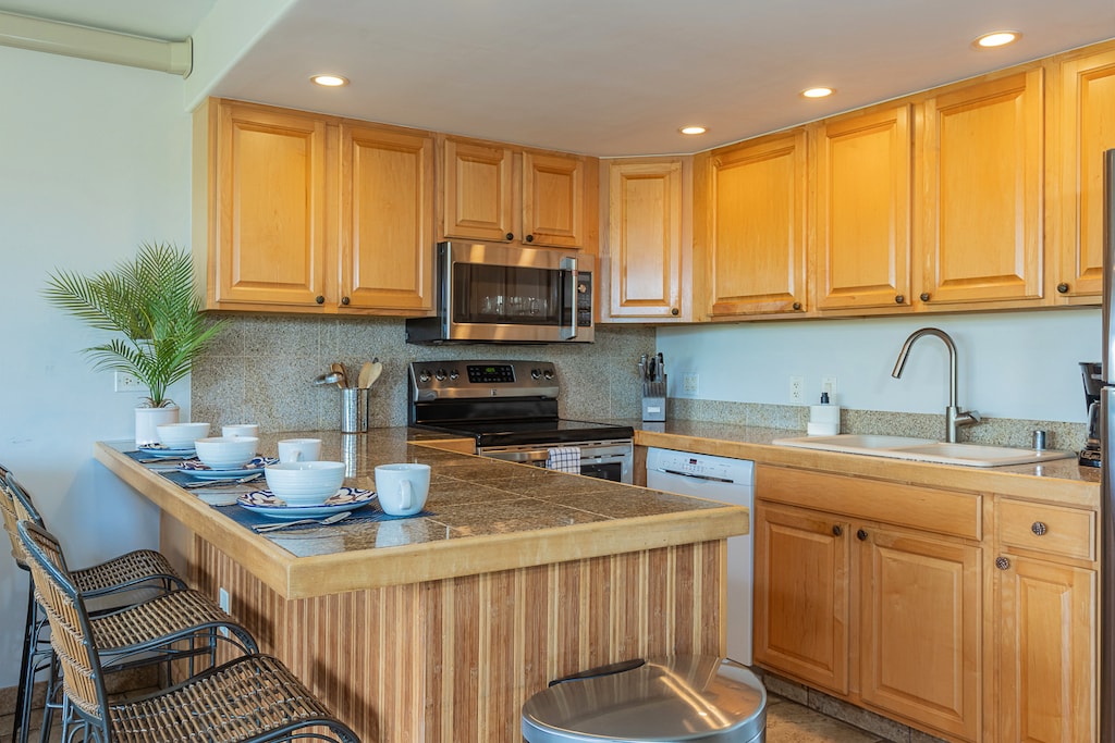 Large living room is quite spacious and features new in 2023 furnishings including cozy sleeper sofa, large Smart TV and tasteful island decor. Bar seating for 3 is perfect for a quick breakfast before heading out on an island adventure. Kitchen is fully stocked with appliances and all cooking and service needs to whip up meals at home.