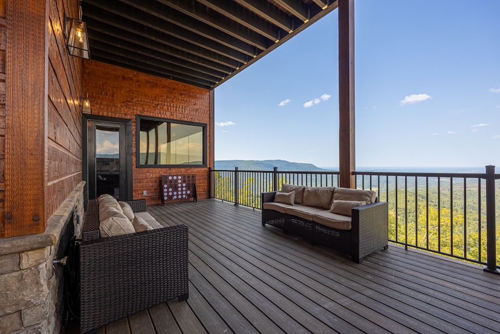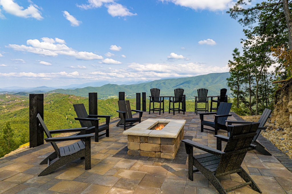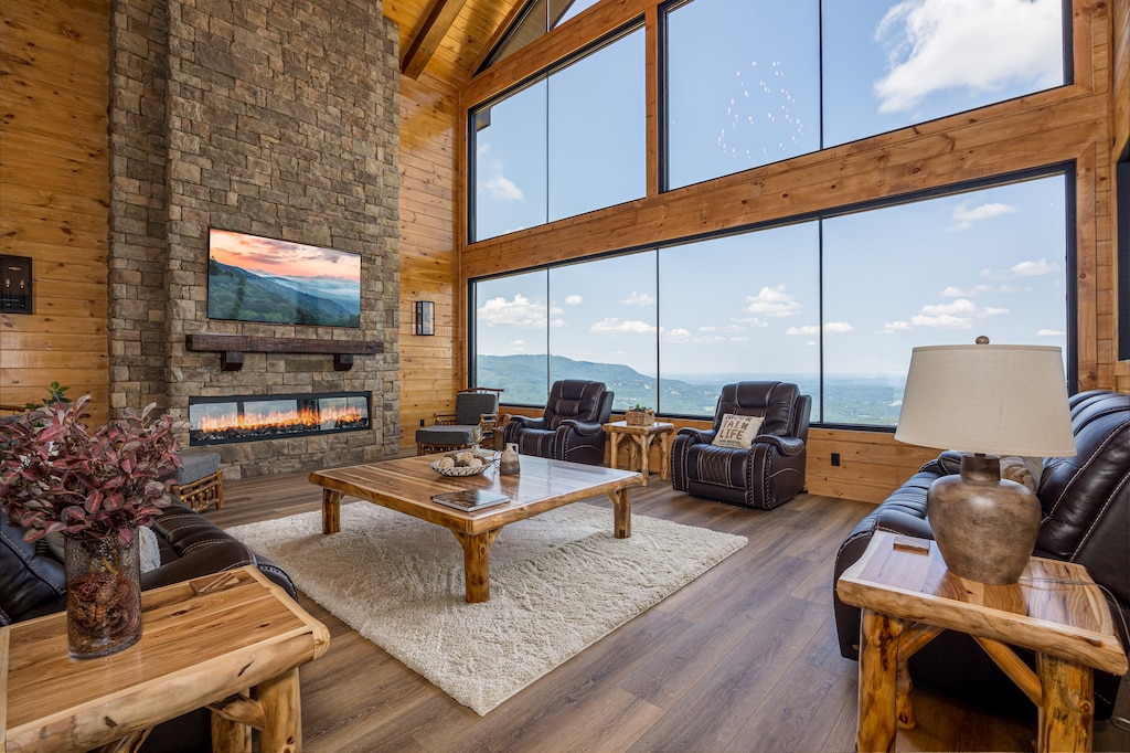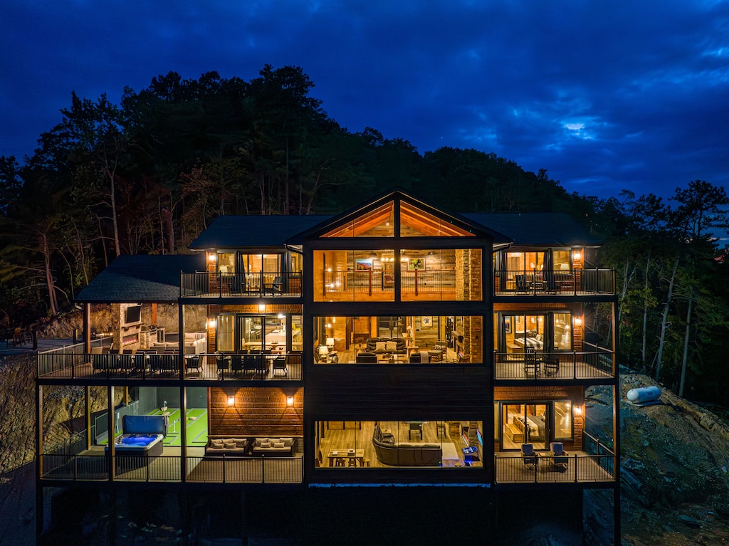 We can’t even begin to list all the incredible amenities you’ll experience firsthand when you stay at Skyfall Lodge! Inside, this 6000-sq ft property offers 6 bedrooms, 6.5 baths, and space for 12 people to spread out comfortably. The main living room features a near-complete wall of windows to help you enjoy that spectacular view from just about anywhere inside. The kitchen is a chef’s dream. And game options abound with pool, foosball, shuffleboard, cornhole, and more!