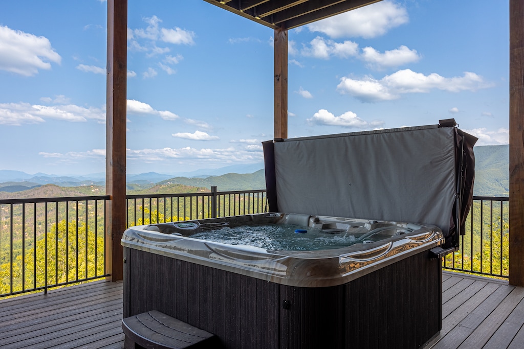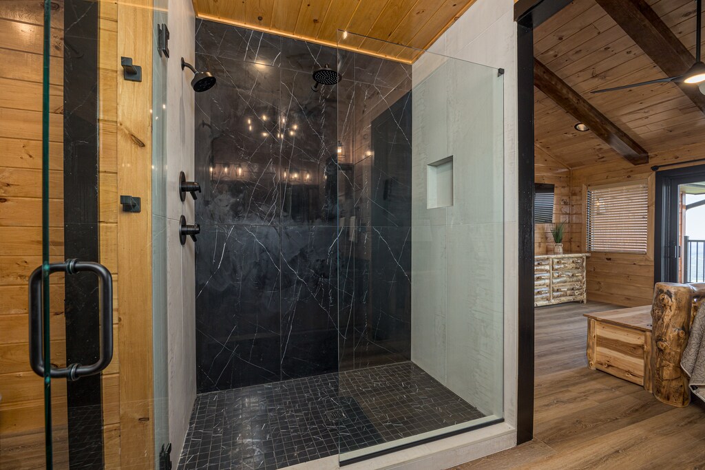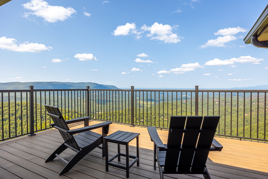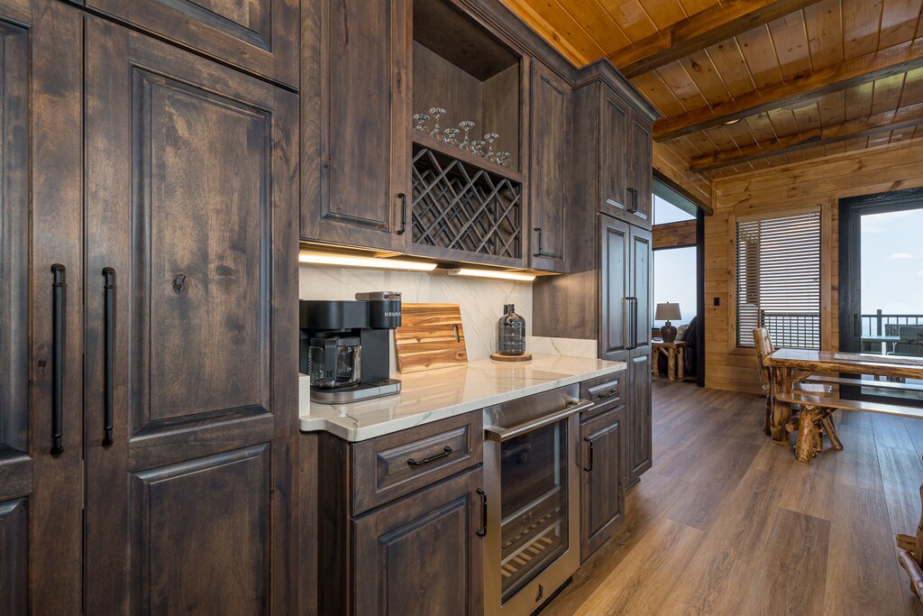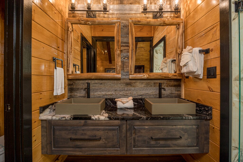 We can’t even begin to list all the incredible amenities you’ll experience firsthand when you stay at Skyfall Lodge! Inside, this 6000-sq ft property offers 6 bedrooms, 6.5 baths, and space for 12 people to spread out comfortably. The main living room features a near-complete wall of windows to help you enjoy that spectacular view from just about anywhere inside. The kitchen is a chef’s dream. And game options abound with pool, foosball, shuffleboard, cornhole, and more!