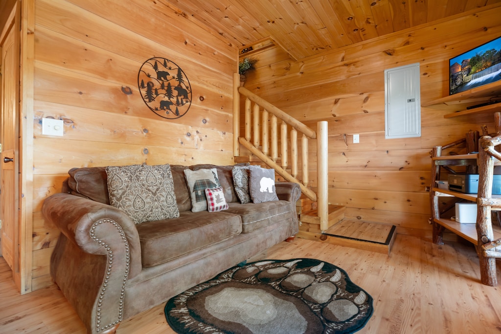 Experience a relaxing stay at Beneath The Stars, a delightful cabin offering 2 bedrooms and 2.5 bathrooms. Enjoy a spacious kitchen, cozy living room with a gas fireplace, and a game room for kids. Adults can relax on the lovely patio or in the king-sized rooms with luxurious amenities. Unwind in the lofted sitting area or the in-room jacuzzi. Immerse yourself in the beauty of the stars and book your stay today!