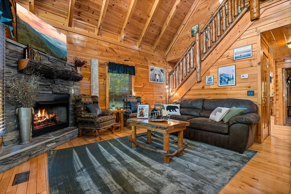 Come experience the Natural Wonder of a trip to the Smoky Mountains. This 4 bedroom, 3 bath cabin for 11 features 3 levels of luxury living. From the spacious king master suite with a jacuzzi tub and small private deck to the home theater with an 8-foot screen, there’s something everyone will love here. There’s a pool table in the game room on the main floor. A hot tub out on the lower deck helps you unwind. A full kitchen and charcoal grill make dining in easy. Of course, you’ll have wifi too!