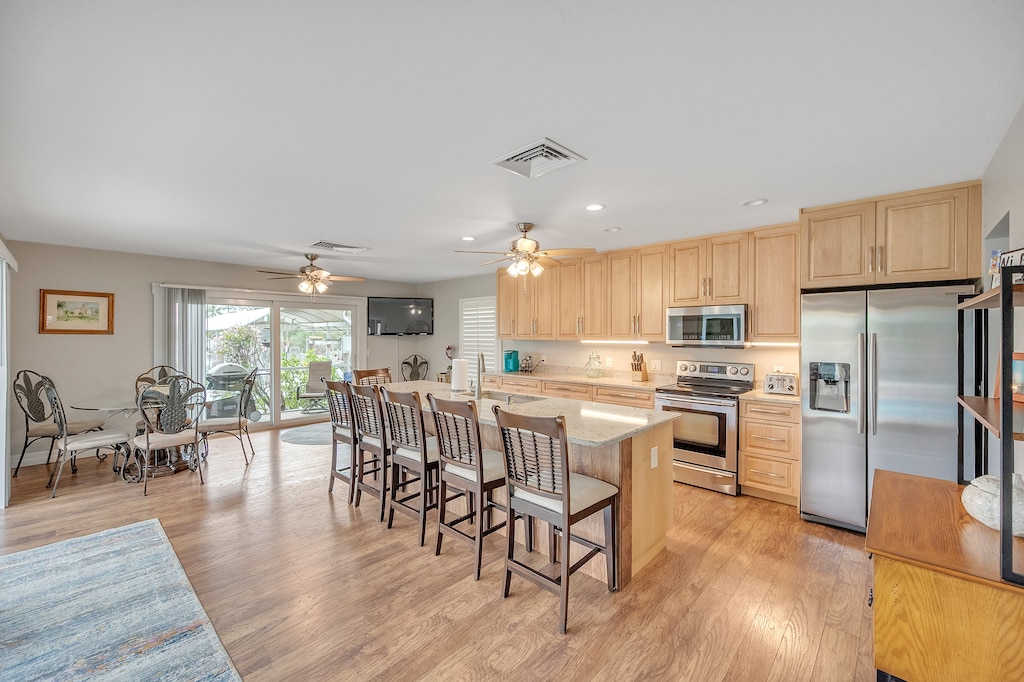 with stainless steel appliances, and hardwood floors throughout.