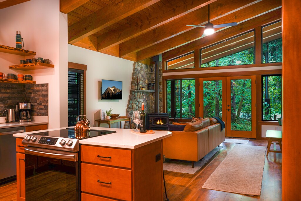 If you feel like heading out, the quaint town of Glacier is only one mile east and has restaurants, bars, coffee shops, and the National Forest Service Center with maps and information about navigating the Mount Baker Snoqualmie National Forest. Mount Baker Ski area is about twenty-five minutes east and offers a vast landscape for all skill levels of skiing, snowboarding, snowmobiling, cross country skiing, snowshoeing, and sledding. The Mount Baker ski area also features two restaurants and a bar, as well as a ski shop for stocking up on gear.
