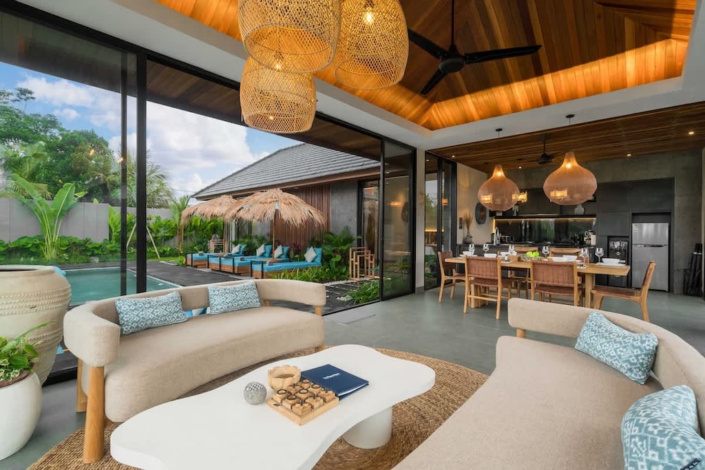 Villa Karoma’s shared living space invites relaxation, with a fully equipped kitchen (including a stylish island), a dining area for shared meals, and cozy sofas arranged for conversation. Glass doors flood the room with natural light, while two ceiling fans ensure a refreshing breeze. An independent toilet adds extra convenience.
