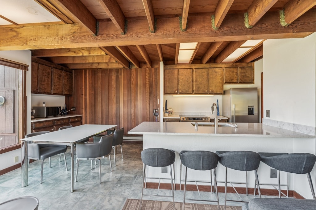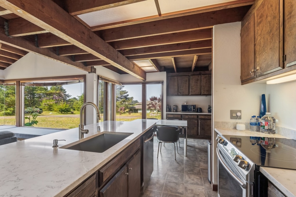 kitchen is equipped for easy home-cooked meals, and the striking stone