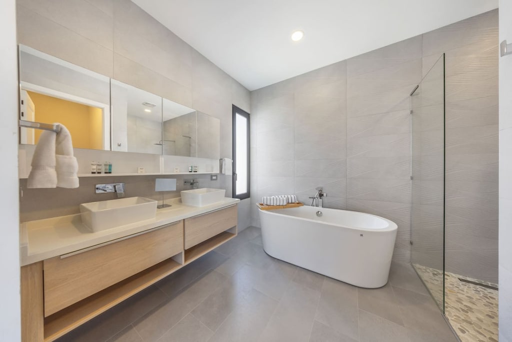 This villa includes a convenient half-bath just off the kitchen, two spacious master suites each with their own en-suite bathroom and walk-in closet, plus two guest bedrooms that share a modern, well-appointed bathroom—perfect for families or groups traveling together.