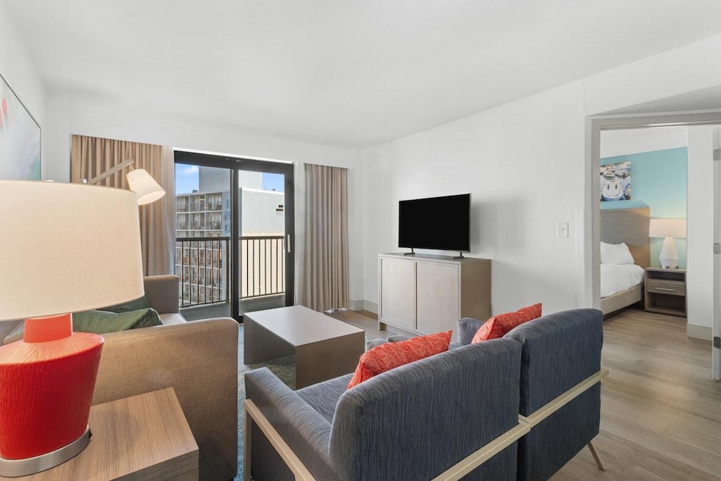 Our Newly Renovated Mariner Ocean View Deluxe Three Bedroom Condo features a master bedroom with a king bed, a second bedroom with a queen bed, and a third bedroom with two queen beds, making it perfect for larger groups or families. The separate living room includes a sleeper sofa, and the condo additionally includes two bathrooms and four televisions. Stay connected with wireless internet access and enjoy the convenience of a fully equipped kitchen, complete with a dishwasher, basic cookware, and dinnerware. Additional amenities include a washer and dryer, along with a private balcony that offers a delightful partial view of the ocean. Experience comfort and style in this inviting ocean view getaway!