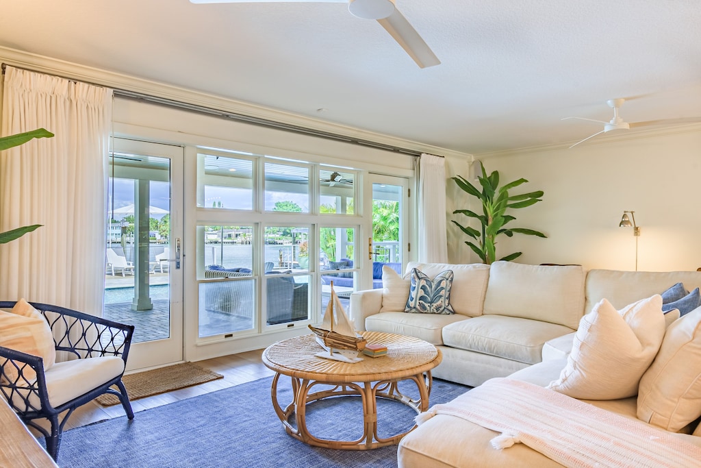 Welcome to Paradise Cove, where you are sure to experience elegance, comfort and style! This 4-bedroom, 3-bathroom home is perfectly situated on the Intracoastal Waterway offering wide water views and unparalleled luxury. When you enter the home you will notice the stunning finishes, coastal decor, and elegant lighting that provide a stylish and inviting atmosphere throughout. Relax in the open and spacious living room featuring an oversized, comfy couch, a big screen TV, and direct access to the amazing outside deck. Off of the living room is the gourmet kitchen; bright and open boasting top-of-the-line appliances and fully stocked with dishware, utensils and cooking essentials needed to create your family meals. Enjoy those meals at the impressive dining table that seats 10. Extra seating is available at the extended kitchen counter.