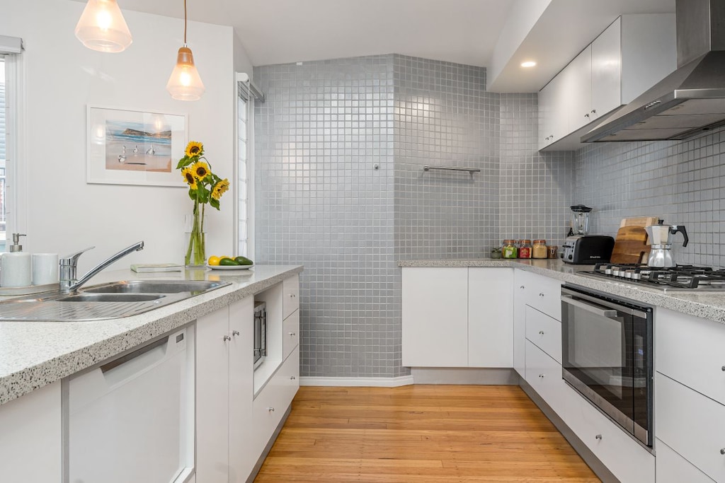 The kitchen is fully equipped with a stove top, electric oven, fridge, dishwasher, and microwave for your convenience.