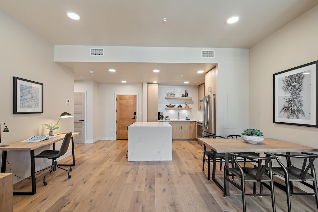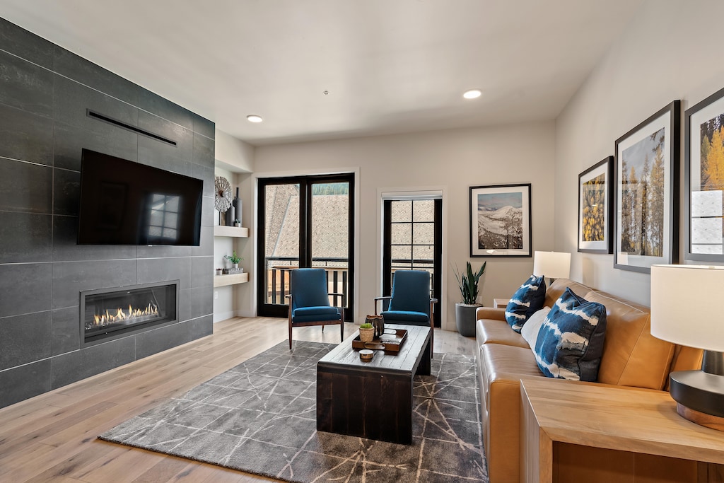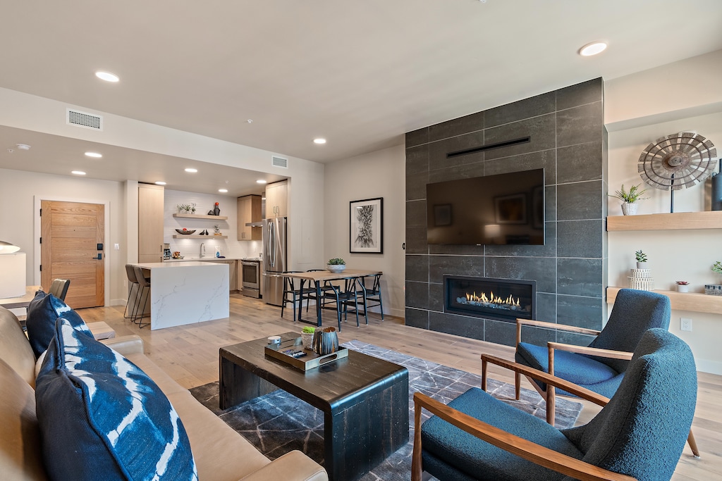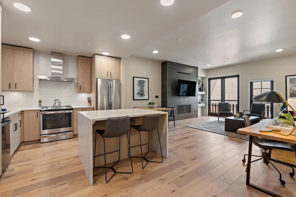 The new Mountain Modern design will not disappoint, featuring an open floor plan with white oak floors and a gas fireplace. This lovely retreat includes a fully equipped kitchen with stainless appliances, quartz counters, and a large center island. The bedroom features a king-sized bed, and the living room has a queen-sized sleeper sofa.