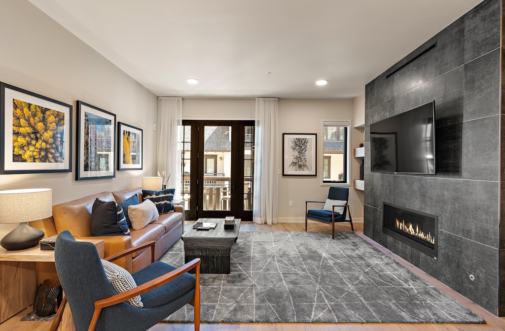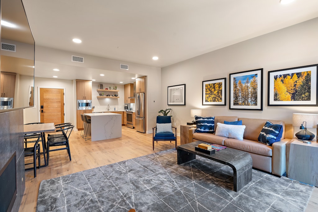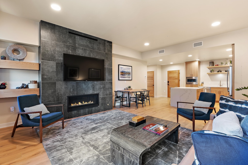 Be one of the first to enjoy the ambiance of staying in this one-bedroom condo with 1 bathroom. It is located on the 4th floor of the Roseberry building overlooking the Village Plaza and also boasts scenic views of Jug Mountain; you can see a glimpse of Lake Cascade from the Master Bedroom. It’s located in the Village Plaza next to Clearwater Coffee, the Village Market, and the Reserve fine dining. This amazing unit features nearly 800 square feet of living space with lots of natural light. This new Mountain Contemporary design will not disappoint, featuring an open-air plan with white oak floors and a gas fireplace. The Master Bedroom has a King-sized bed, and the Living Room has a Queen sleeper sofa. This lovely retreat includes a fully equipped kitchen with stainless appliances, quartz counters, and a large center island. Guests will enjoy free Wi-Fi and cable TV plus use of the temperature-controlled underground parking garage. The location is ideal! You are located only a few short steps away from dining, shopping, and the base of the ski hill.