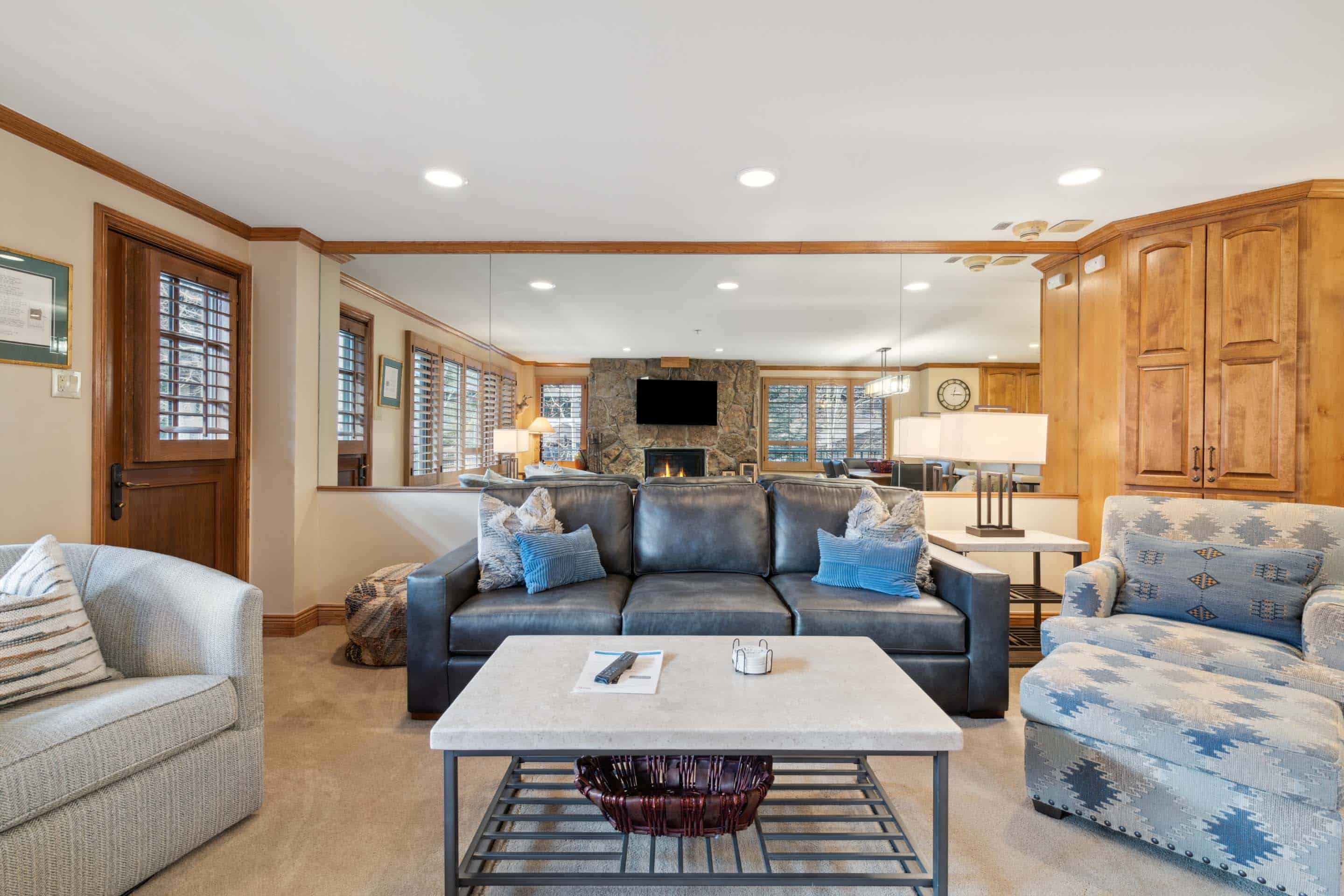 Set at the base of Vail Mountain and steps from Gondola One, this 3-bedroom residence, finished in classic mountain décor, offers a family room with a wood burning fireplace, a chef’s kitchen with stainless steel appliances and granite countertops, and a dining area for six. Additional features include three guest suites, each with an attached bathroom (one has a king size bed, two have two queen size beds), and garage parking.