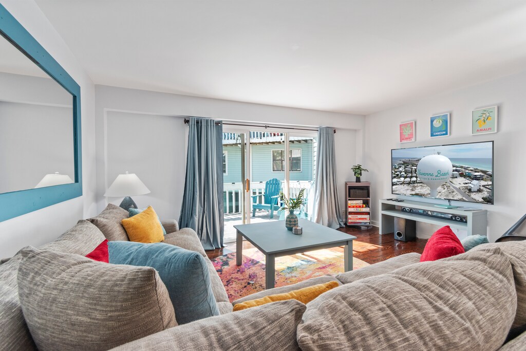Inside, you’ll find a fresh, inviting space with new furnishings, updated flooring (no carpet!), and a bright, beachy vibe throughout. The main floor features a spacious living area with a comfy couch for lounging and watching TV, plus sliders that lead out to a sun deck—ideal for catching rays, flipping through your vacation read, or simply soaking in the breeze.