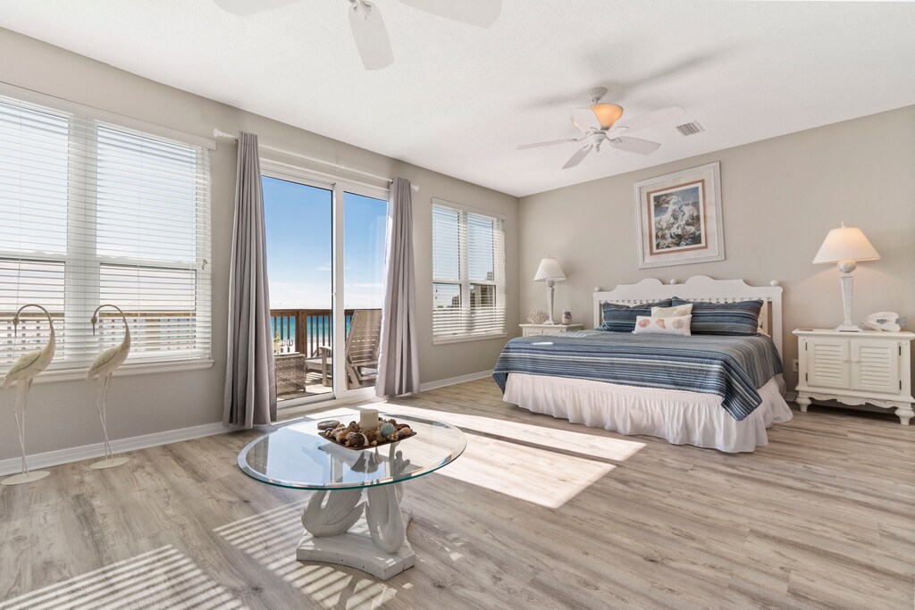 Upstairs, the king-sized primary suite is a true retreat with a Gulf-front private balcony, a daybed for lounging or extra sleeping space, and a convenient wet bar with a mini fridge—ideal for enjoying your morning coffee or an evening nightcap without leaving the room. The ensuite bath includes a Jacuzzi tub, walk-in shower, and private water closet.