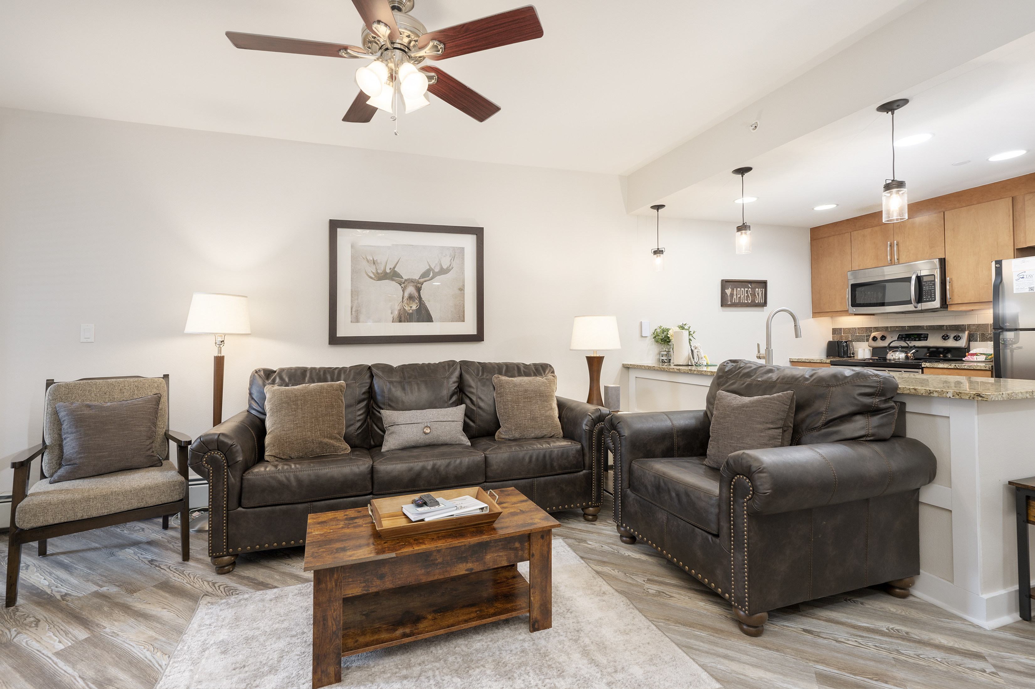 The additional square footage and views offered by this condo are a result of its corner unit location. The living space features a complete kitchen, dining area, and lounge equipped with a large flat-screen television, a gas fireplace, and a private balcony.
