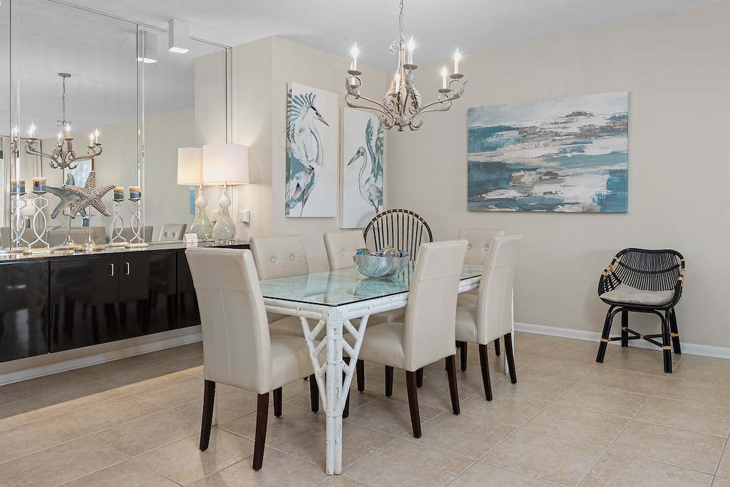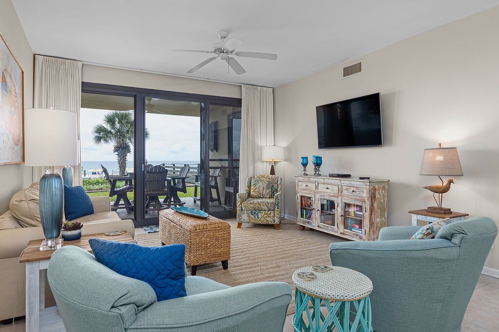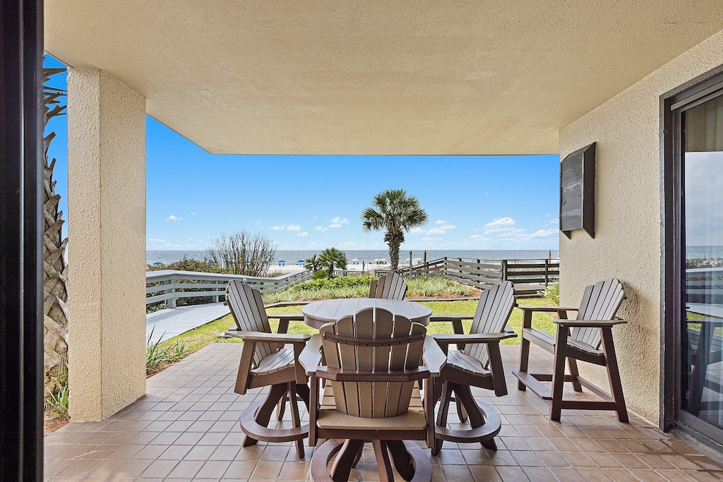 Romar House 101A offers a delightful ground-floor escape with no elevator wait. This spacious three-bedroom, two-bathroom condominium features a fully equipped kitchen with an under-counter ice machine, perfect for preparing meals or enjoying local cuisine. The dining area and living room seamlessly connect to a Gulf-front balcony with ample outdoor seating. The primary bedroom boasts a king bed and direct access to the balcony. Its private bathroom includes a separate dressing area and a tiled walk-in shower with a built-in bench. The first guest bedroom also has a king bed, while the second features two double beds. These guest bedrooms share a hall bathroom with a tub-shower combination. For added convenience, the condo includes a full-size washer and dryer and flat-screen TVs in all bedrooms. A sleeper sofa in the living room provides additional sleeping arrangements.