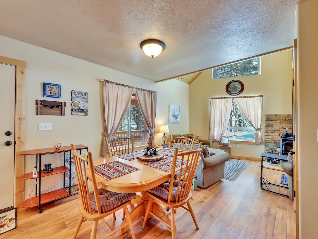"Nestled in peaceful woods, Centurion Hideaway offers a private family retreat. The spacious front room with tall ceilings and large windows provides natural light by day and a stunning night sky view. The loft features two queen beds and a bathroom.